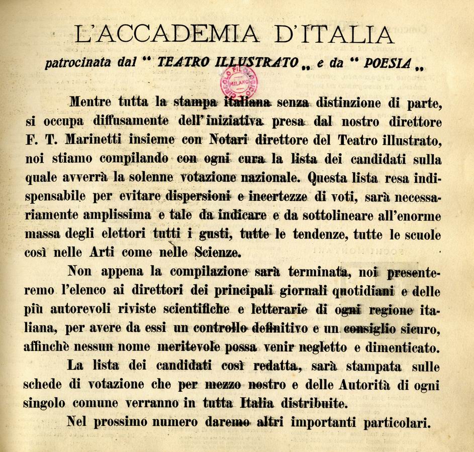 [L'Accademia d'Italia patrocinata dal «Teatro illustrato» e da «Poesia»