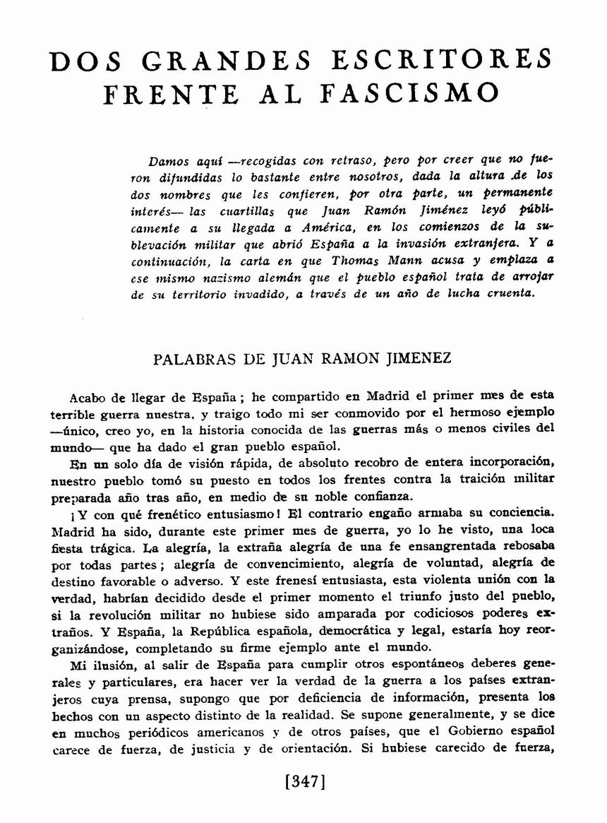 Dos grandes escritores frente al fascismo: Palabras de Juan Ramón Jiménez